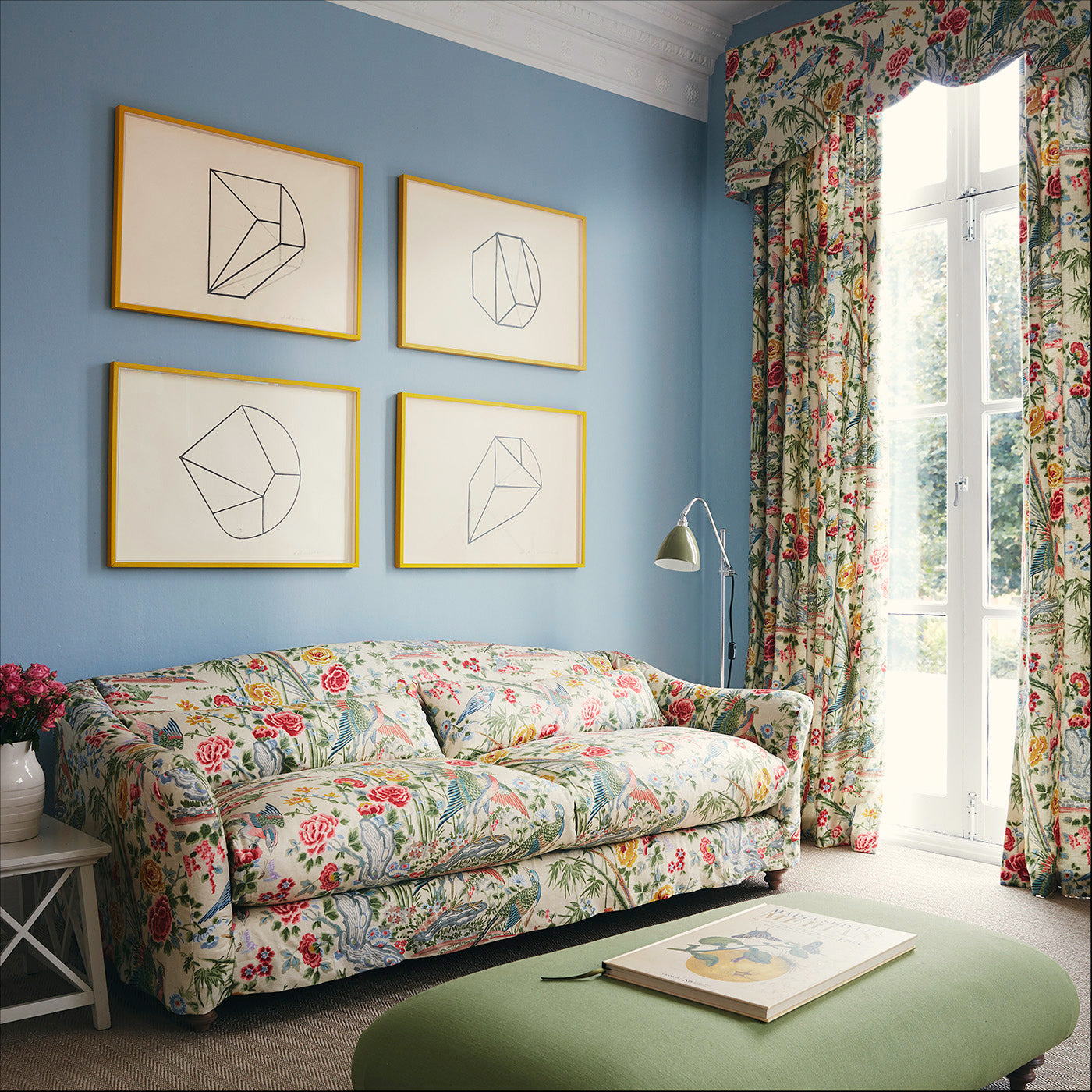 Oriental flowers and bamboo combine to create a sophisticated yet playful design. Printed on the finest linen fabric, which is durable enough for upholstery yet drapes beautifully for curtains.