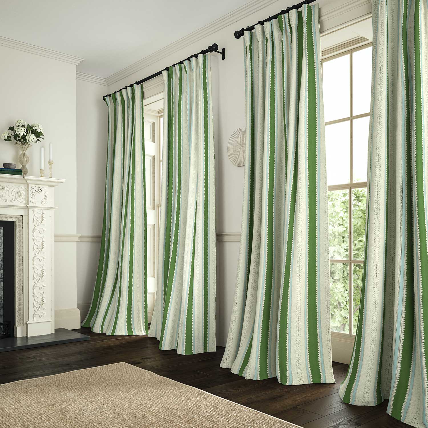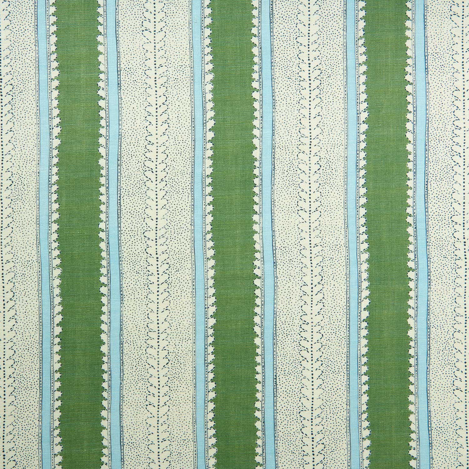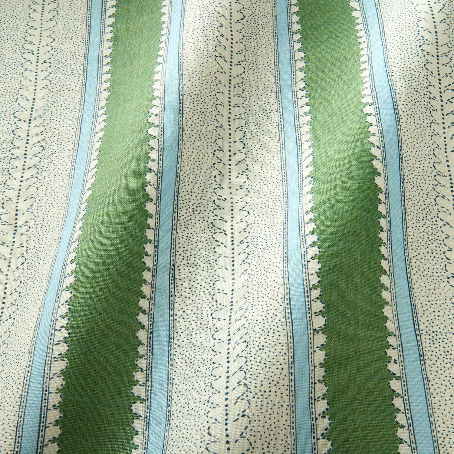 This lovely printed stripe on pure linen fabric, with its bright colour bands and subtle dots and dashes, is suitable for both curtains and upholstery.