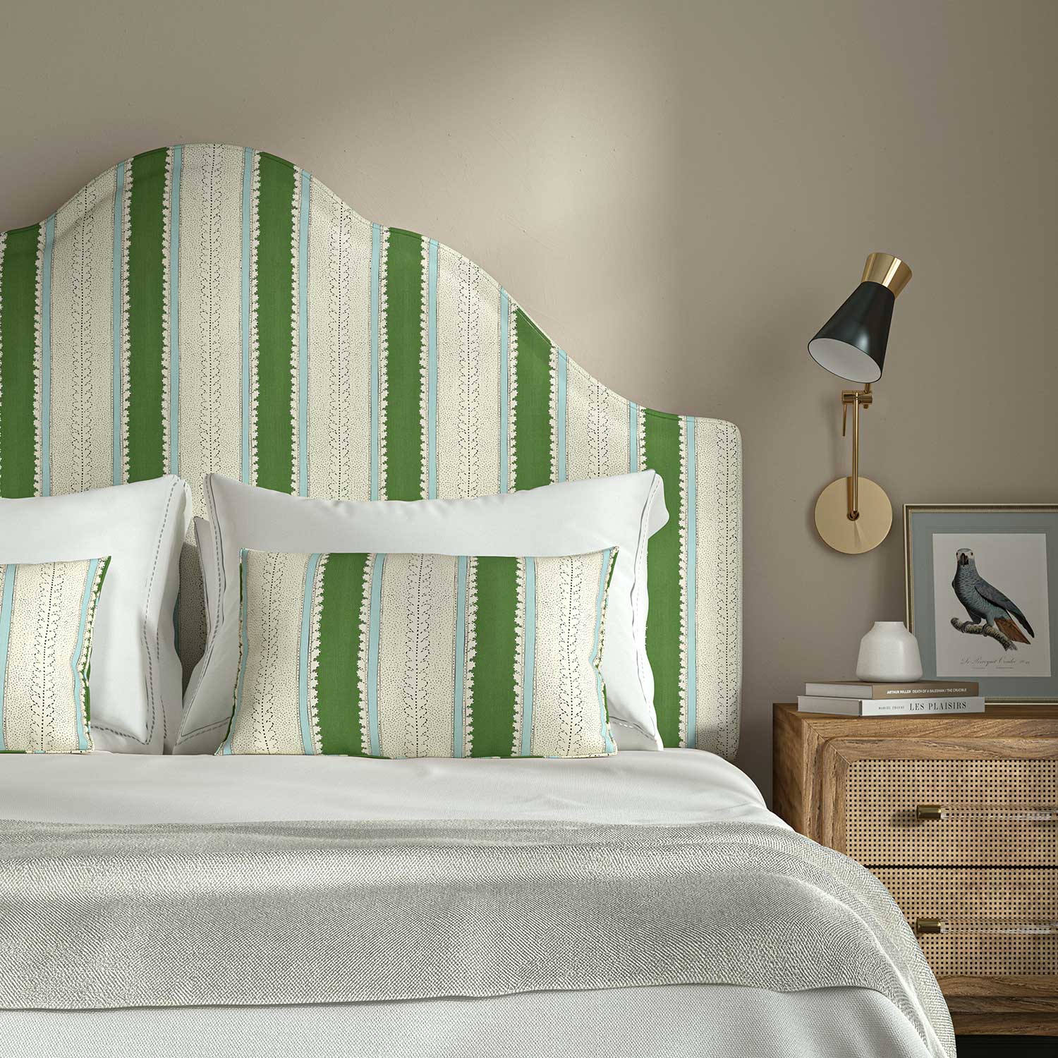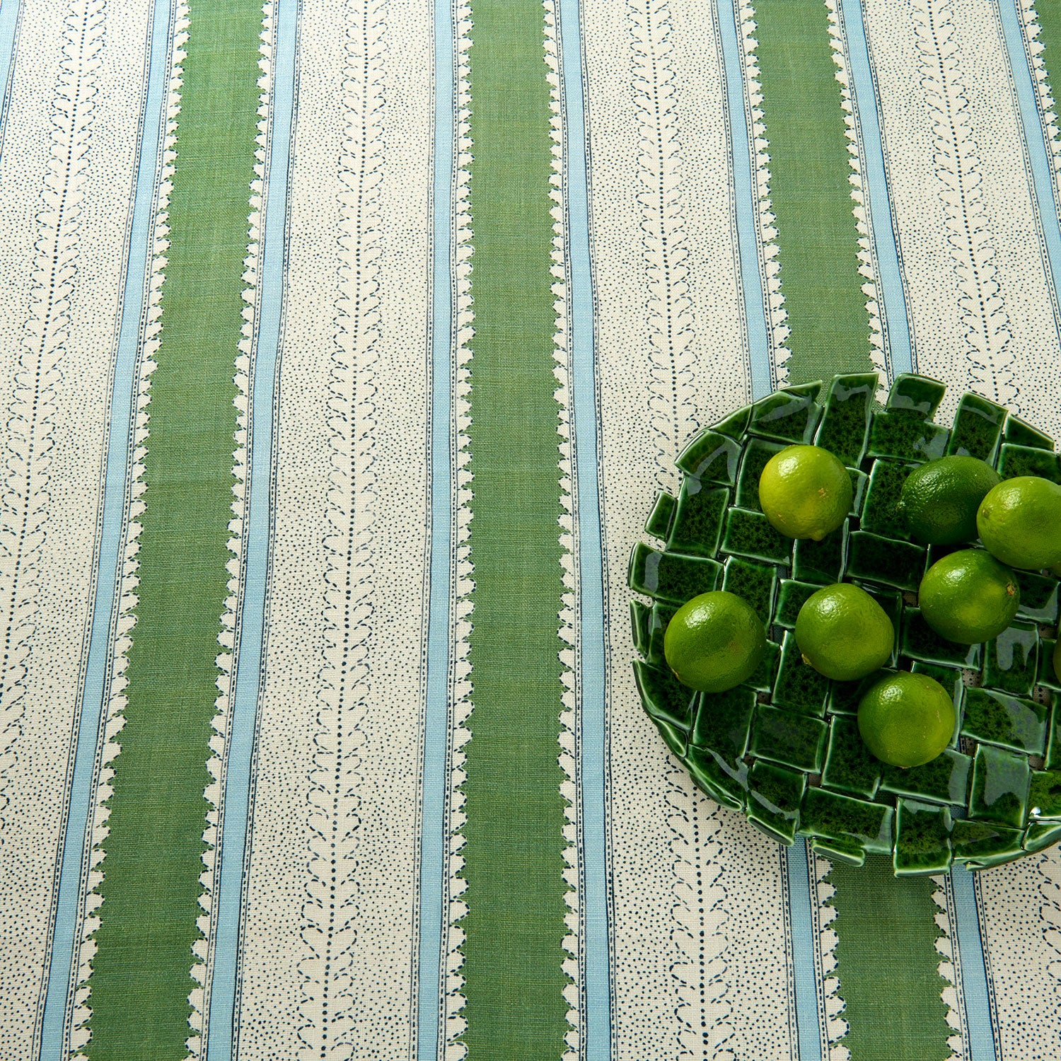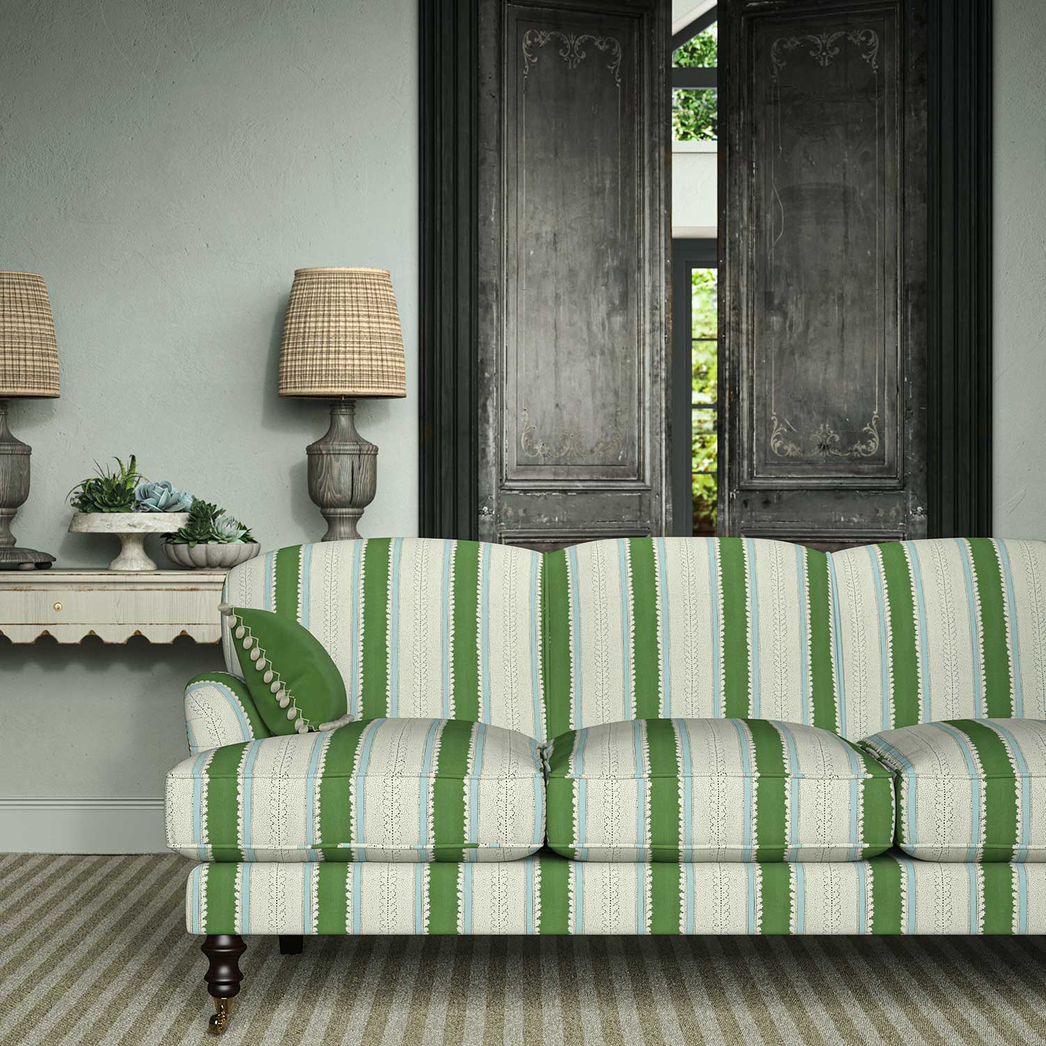 This lovely printed stripe on pure linen fabric, with its bright colour bands and subtle dots and dashes, is suitable for both curtains and upholstery.