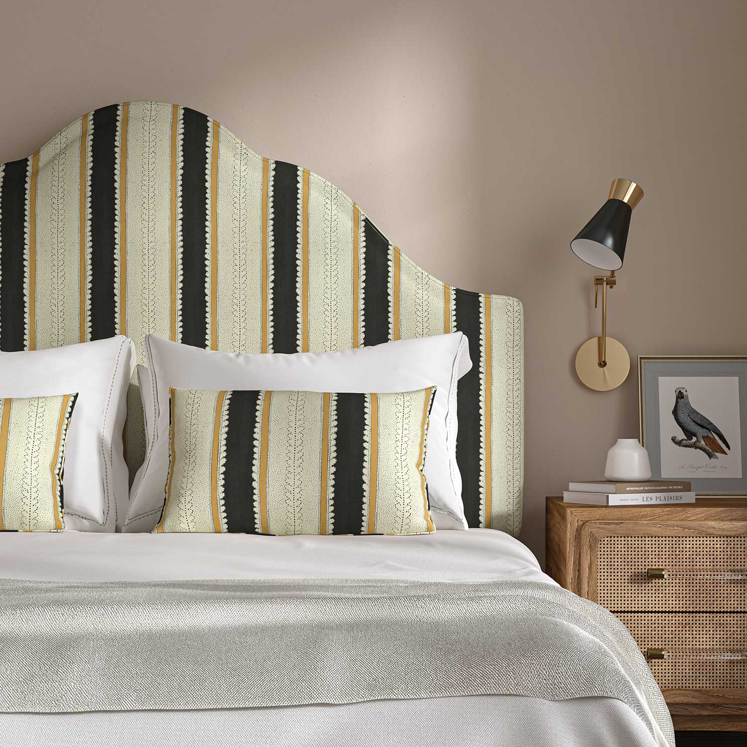 This lovely printed stripe on pure linen fabric, with its bright colour bands and subtle dots and dashes, is suitable for both curtains and upholstery.
