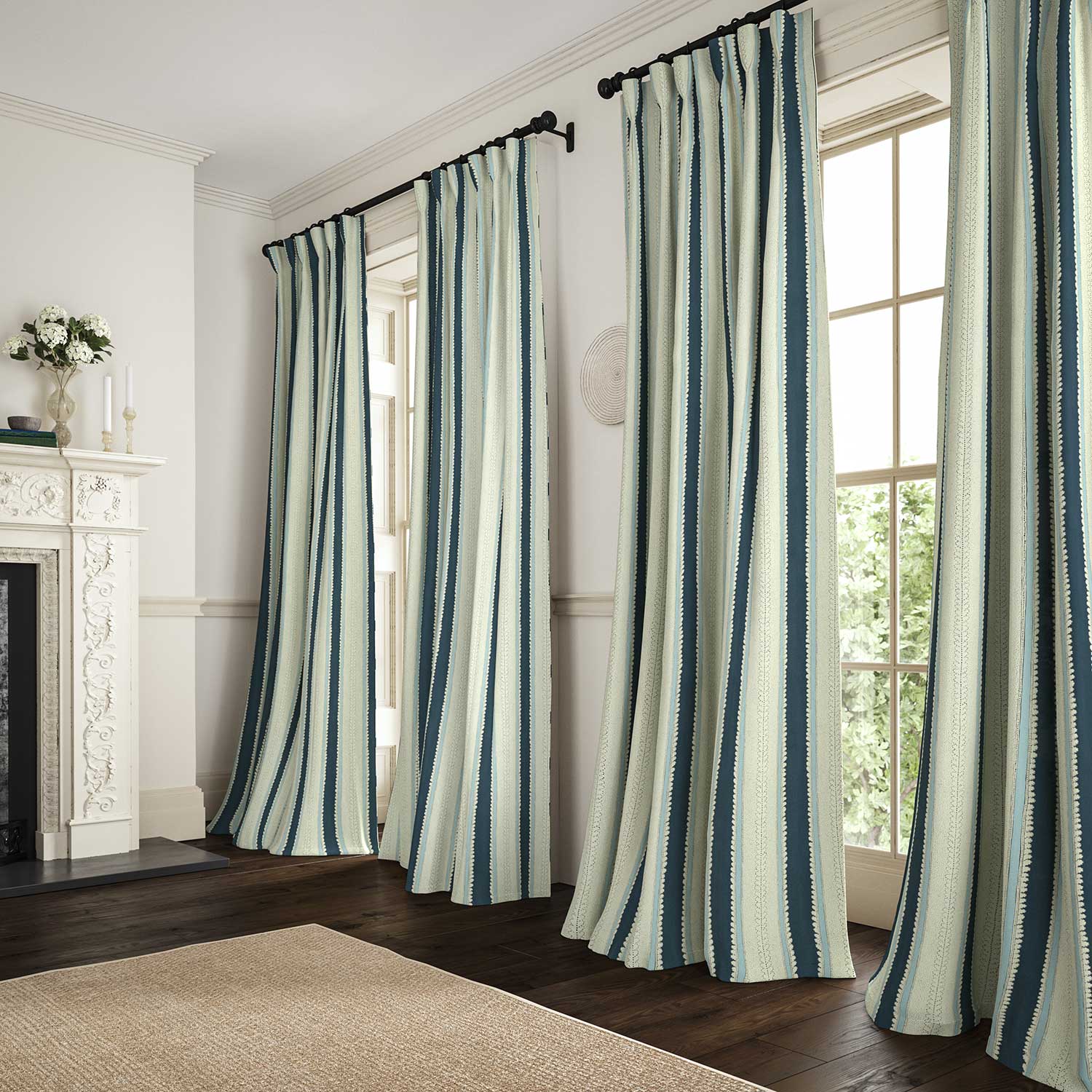 This lovely printed stripe on pure linen fabric, with its bright colour bands and subtle dots and dashes, is suitable for both curtains and upholstery.