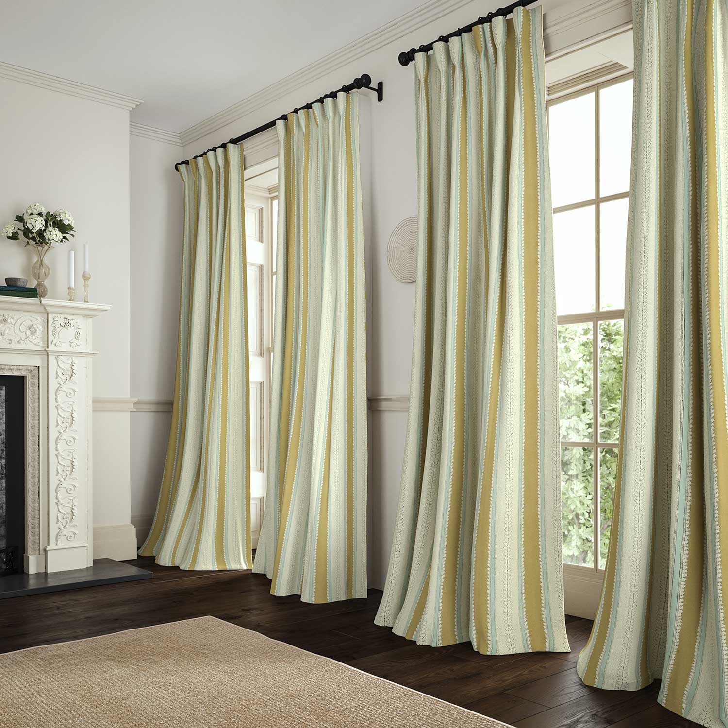 This lovely printed stripe on pure linen fabric, with its bright colour bands and subtle dots and dashes, is suitable for both curtains and upholstery.
