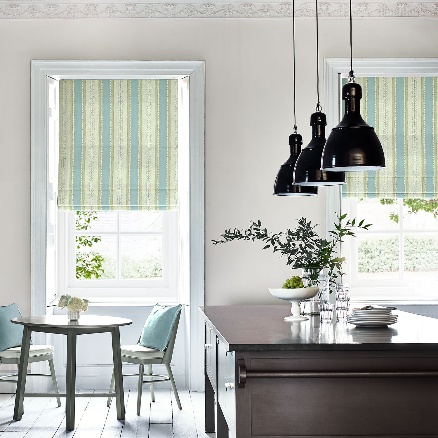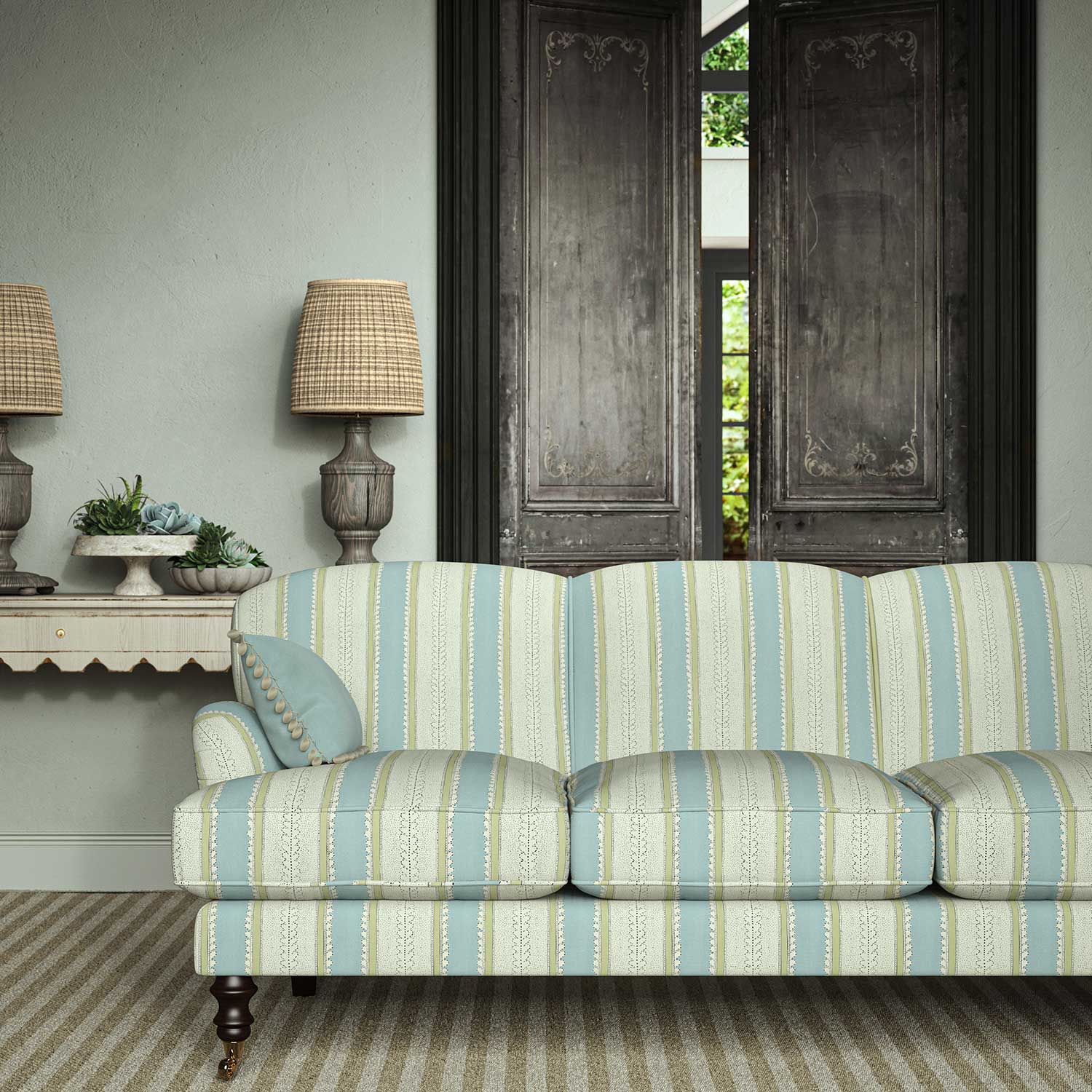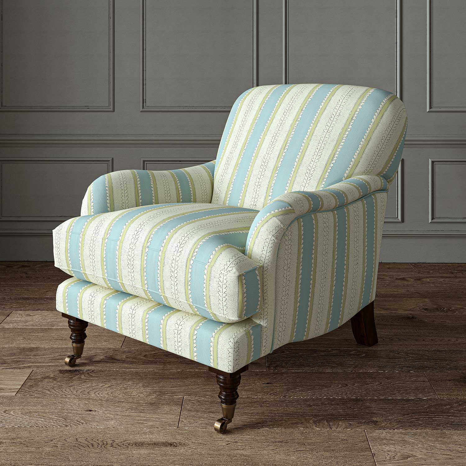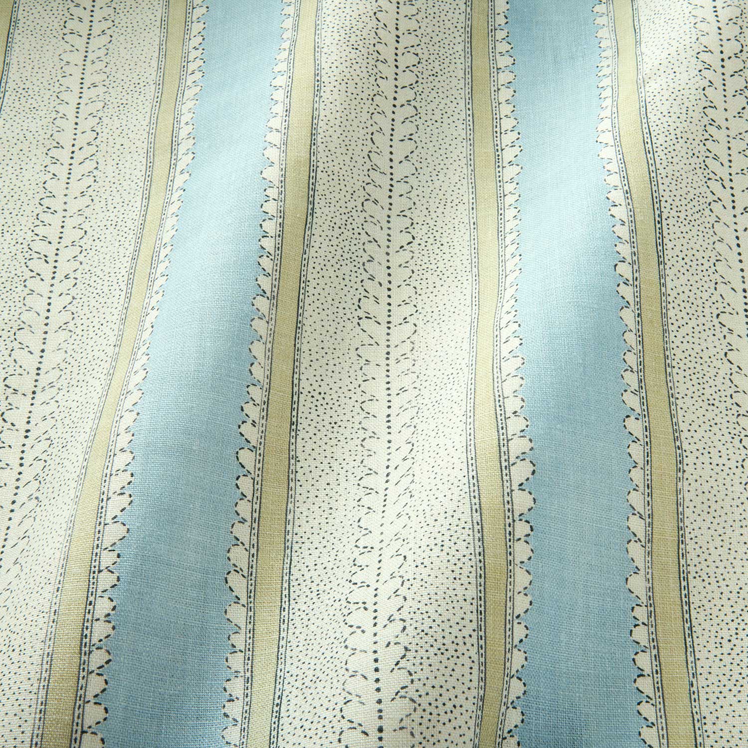 This lovely printed stripe on pure linen fabric, with its bright colour bands and subtle dots and dashes, is suitable for both curtains and upholstery.