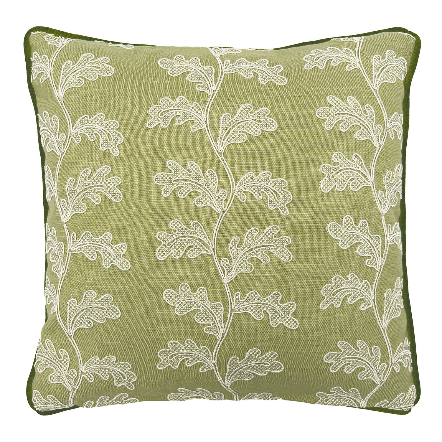 Part of Linwood's Titania collection, the Helena Embroidered Cushion in Canopy by Linwood features a striking oak leaf motif, intricately stitched in pure white thread using the traditional couching technique. Set against a green cotton-linen ground, the embroidery feels both bold and timeless. The pattern is shown on both sides and finished with a plush velvet trim; this designer cushion brings richness, craftsmanship, and quiet luxury to any interior scheme.