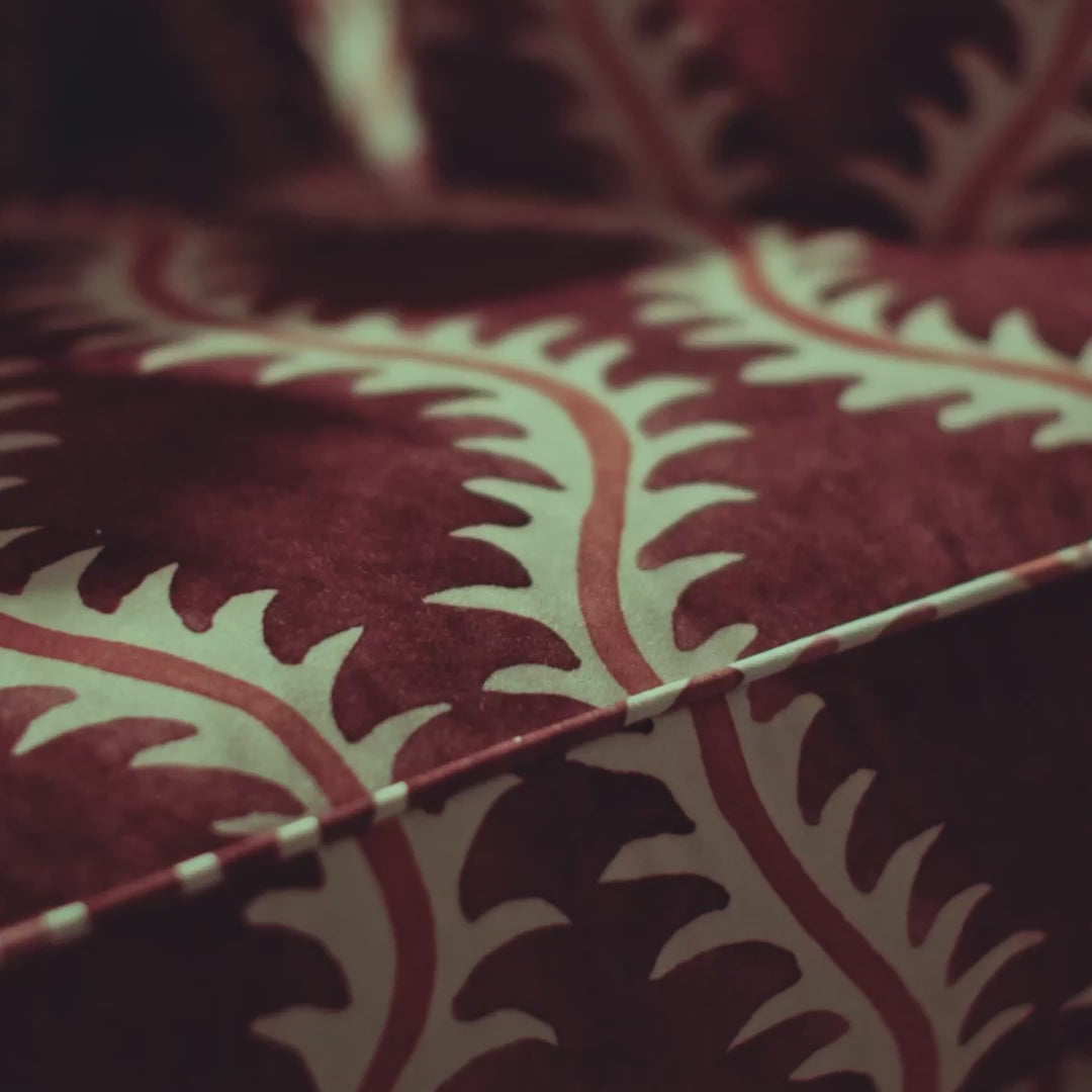 The rich pile of velvet, known for its softness, adds depth to Helter Skelter's iconic stylised fern pattern. Utterly timeless, this luxurious printed velvet is suitable for both upholstery and curtaining.