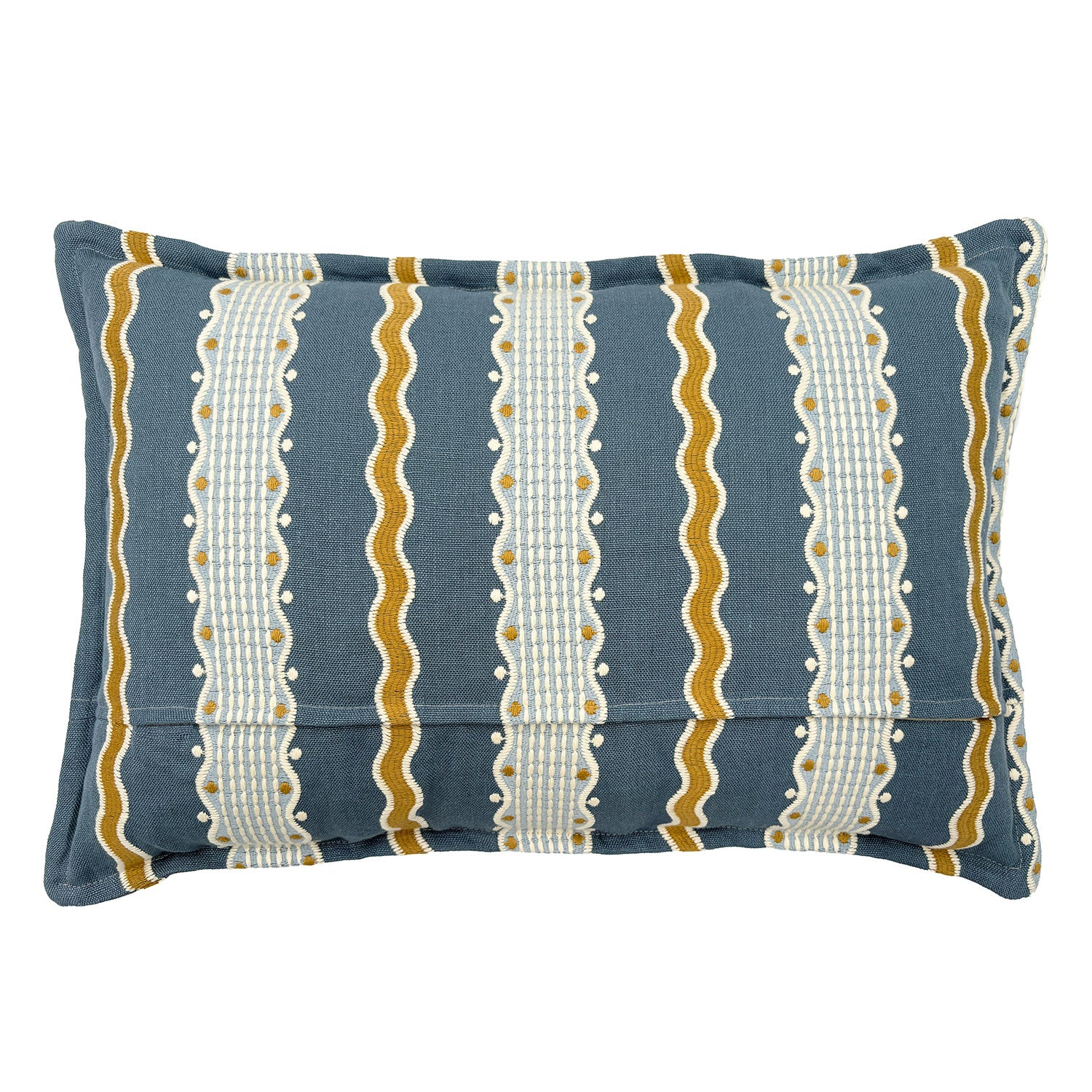 From Linwood's Titania collection, the Hermia River Embroidered Cushion captures the calm movement of water through its rhythmic stitched pattern. Expertly embroidered on pure linen in serene blue and golden tones, it features bold undulating waves and finely stitched geometric lines. Finished with a smart Oxford edge and the same fabric on both sides, this timeless cushion evokes tranquillity, balance, and refined craftsmanship.
