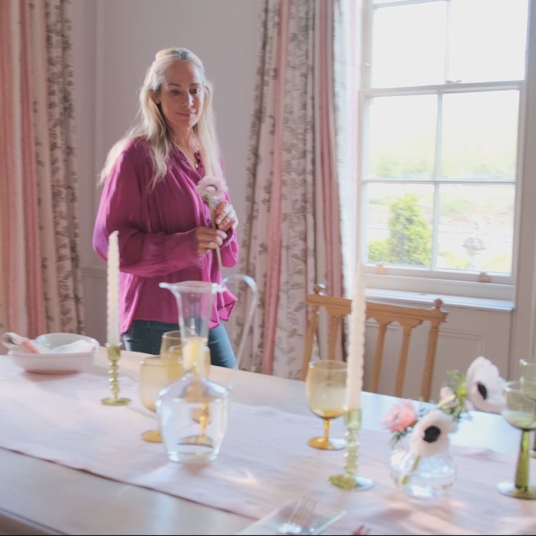 Sophie @mygeorgianhome talks about her elegant dining room featuring our printed linen Hester (Pink Green).