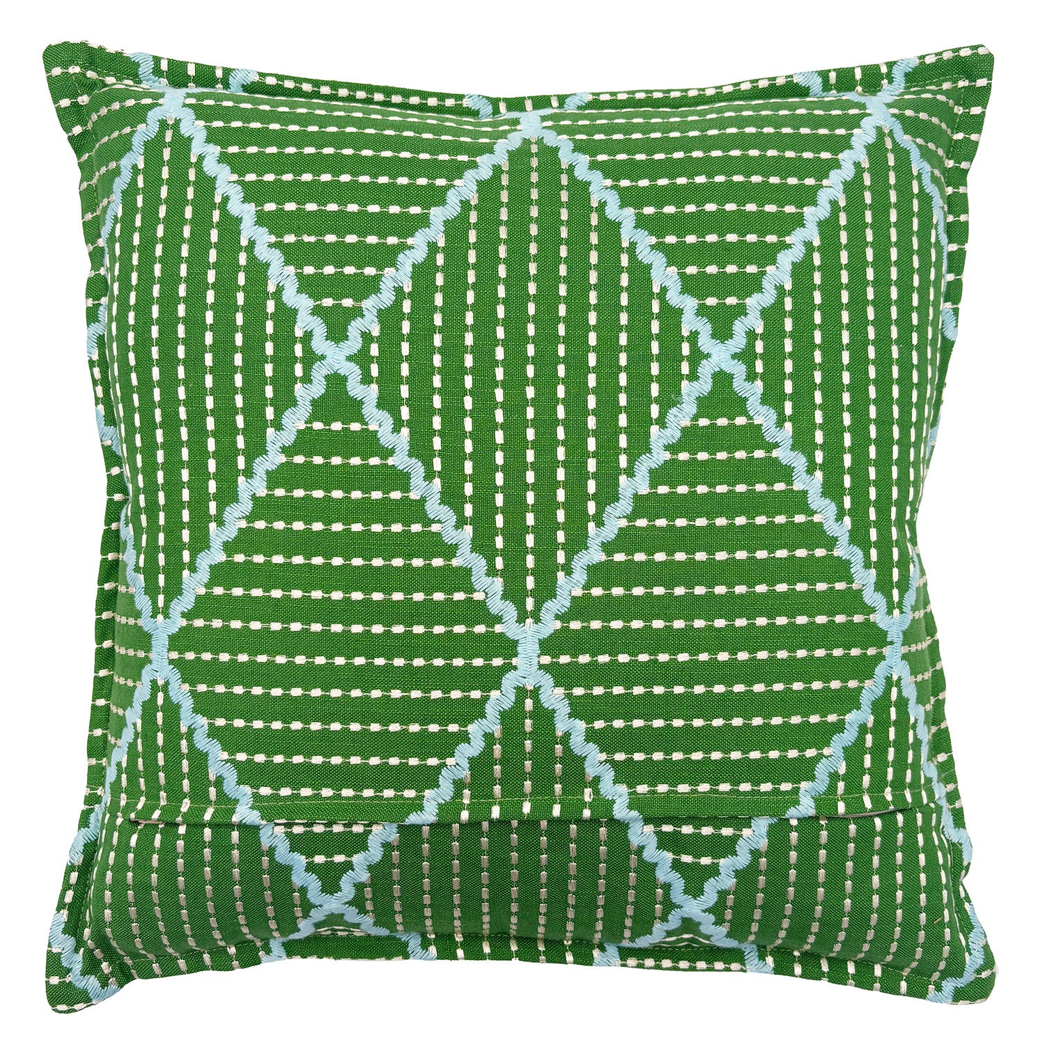 The Oberon Glade Embroidered Cushion is part of Linwood's Titania collection. Featuring a diamond trellis pattern with flowing lines and rickrack detail, it's crafted on a premium cotton-linen ground in vibrant green tones. Embroidered on both sides and finished with a smart Oxford edge, this cushion blends graphic precision with artisanal character.