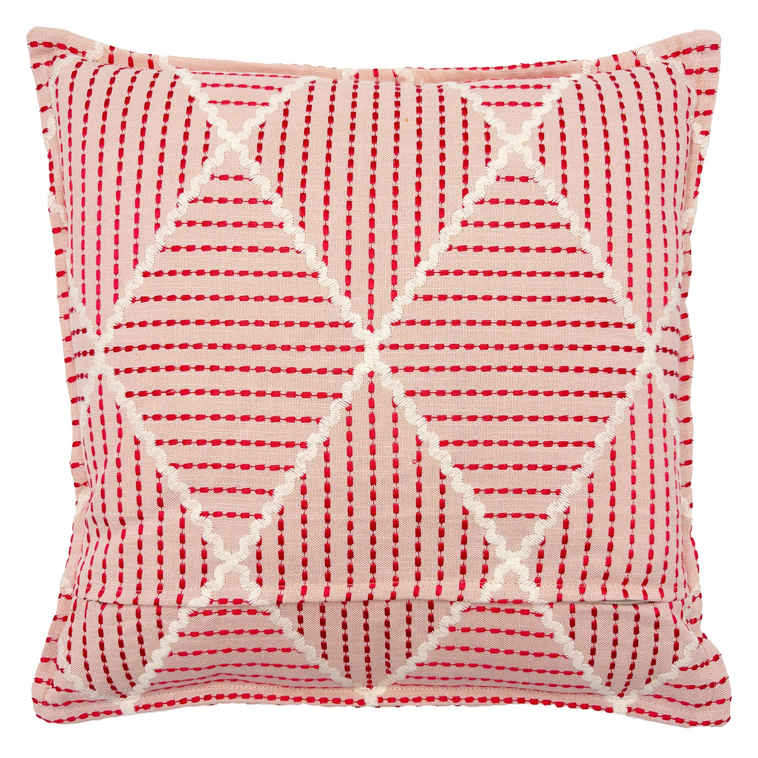 From Linwood's Titania collection, the Oberon Strawberry Embroidered Cushion features intricate diamond trellis design enhanced with flowing lines and delicate rickrack detail. Crafted on a premium cotton-linen ground in radiant red and pink tones, this refined design is embroidered on both sides and finished with a smart Oxford edge for a beautifully balanced look.
