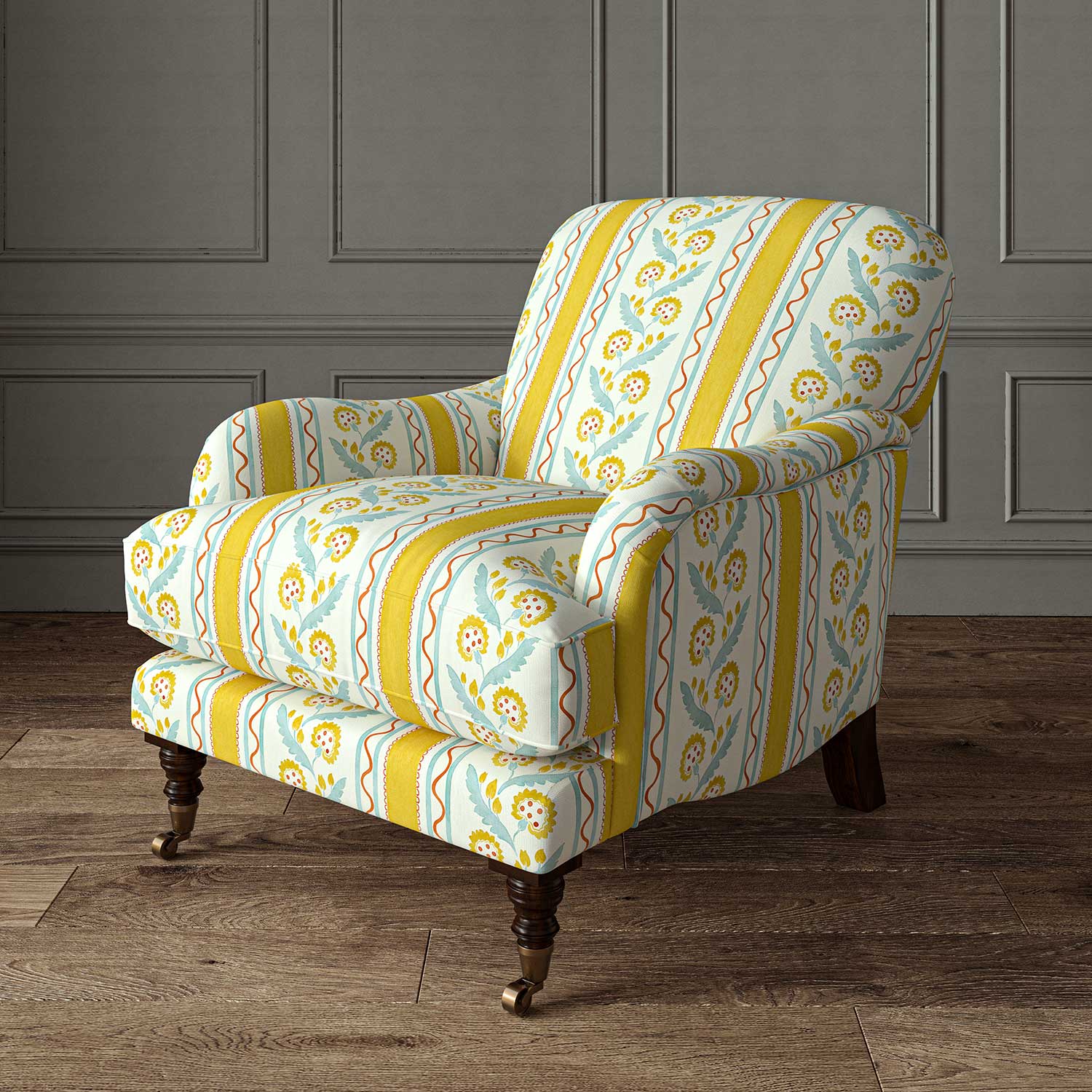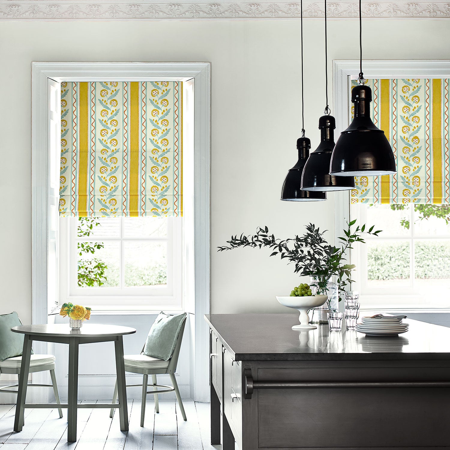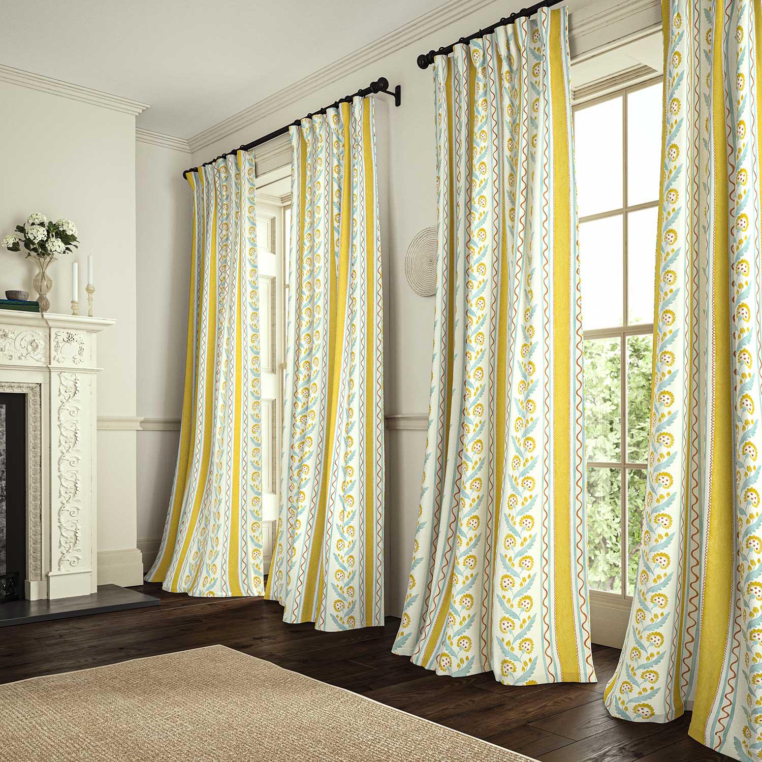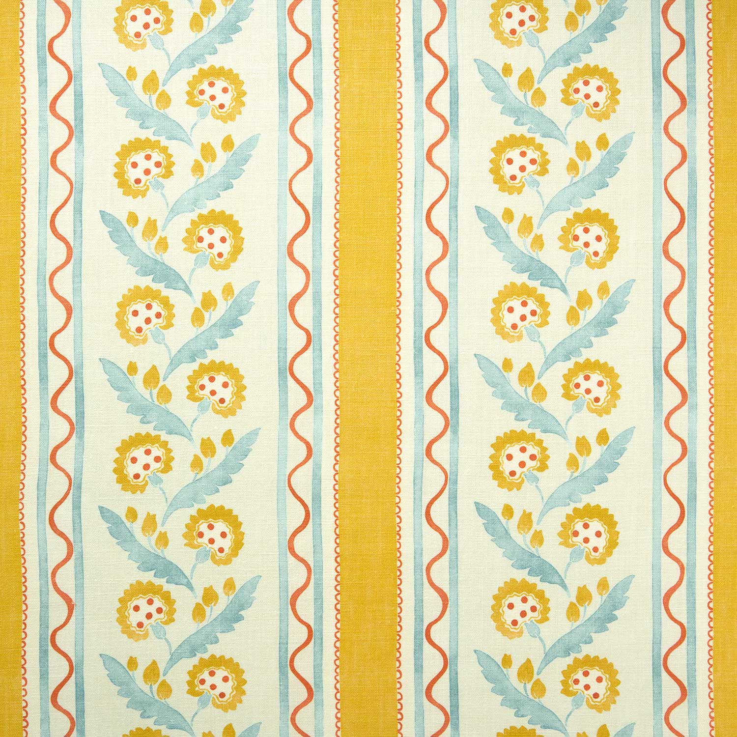 This stripe depicts a stylised dandelion framed by bands of complementary colour, edged with a playful, wavy line. Printed on the finest textural linen fabric, Polly Stripe will bring a contemporary twist to every interior project.