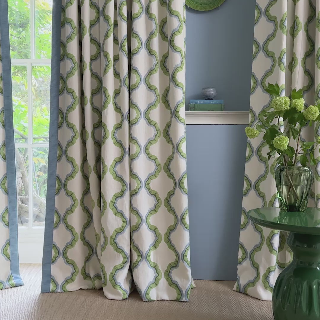 Drawing inspiration from an 18th-century Portuguese tile, the creative team produced a stunning painterly design with a mirrored ribbon pattern. This is the ideal linen curtain fabric; just imagine how Ruffled would cascade beautifully. Available on both colourful and plain grounds. Also suitable for upholstery.