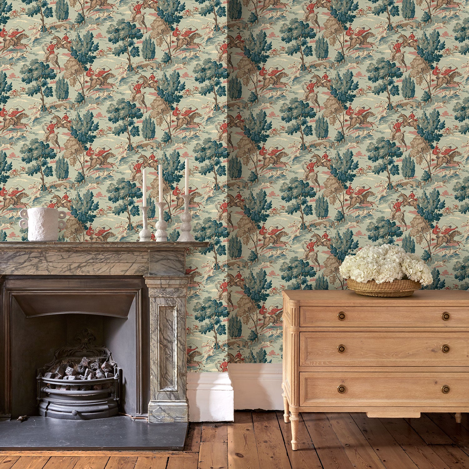 Part of the Sporting Life collection, this wallpaper in timeless Aqua showcases the British hunt: red coats, hounds and beautiful scenery abound.